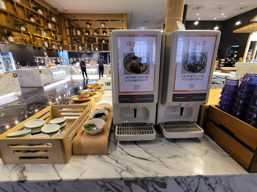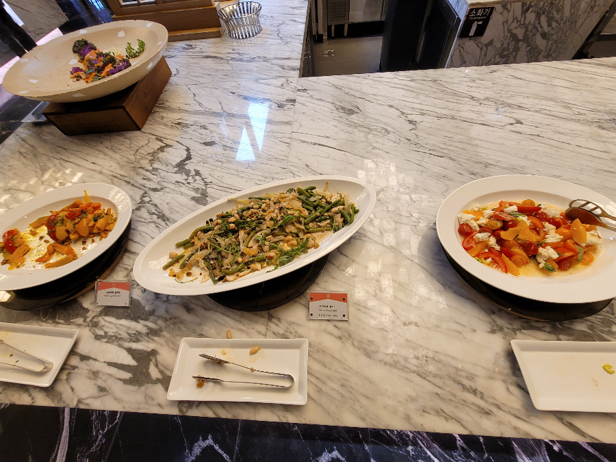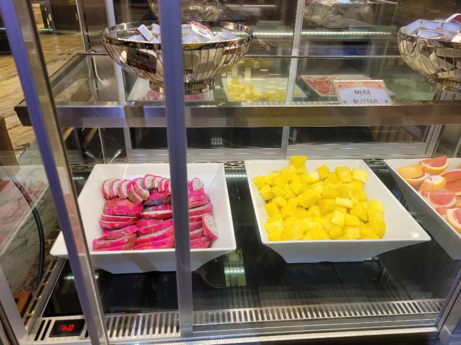 그랜드테이블 조식뷔페는 한식, 양식, 일식의 다양한 메뉴와 과일과 치즈등 디저트 류도 잘 준비되어 있었어요, 하지만 전반적으로 음식이 식어(?) 있었고 즉석요리가 적었다는 단점이 있네요?