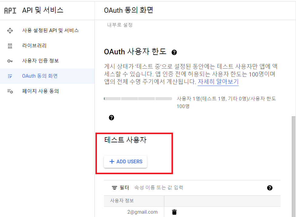 API 및 서비스 메뉴 > OAuth 동의 화면 (선택)