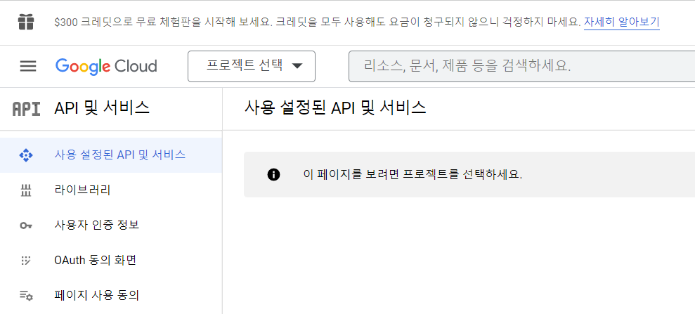 프로젝트가 생성되어, API키, OAuth, 서비스 계정 항목이 추가 되었습니다.