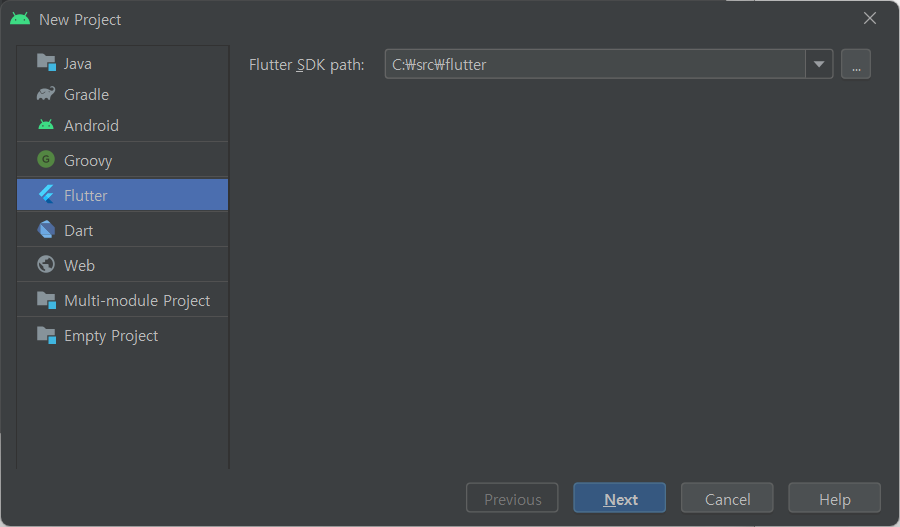 Flutter SDK 폴더를 지정하면 앞에 Flutter 프로젝트 생성 화면으로 돌아 옵니다.