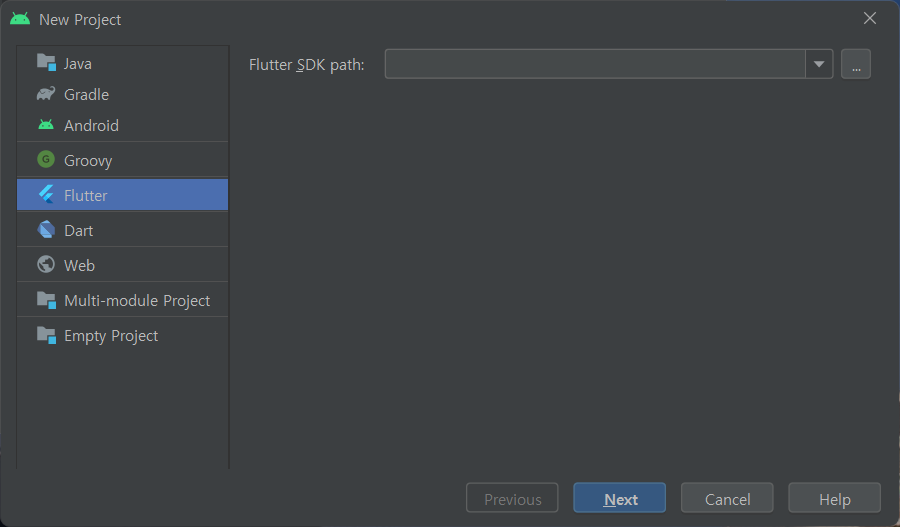 New Flutter Project 를 선택한 후 SDK path를 등록 합니다.