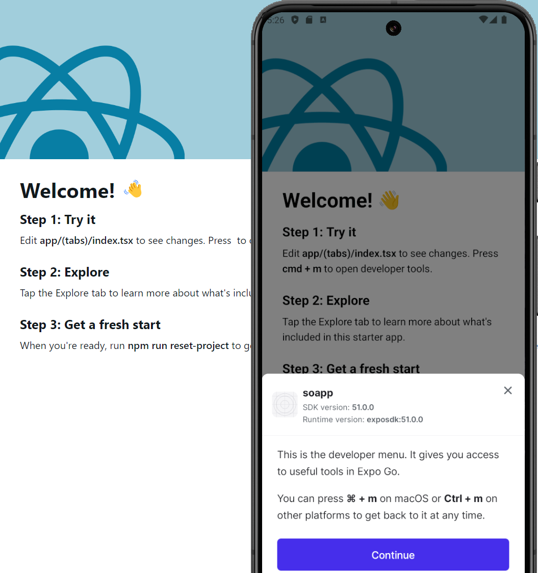 프로젝트 생성 후 실행하면 Expo를 통해 웹과 앱에서 바로 확인 가능!