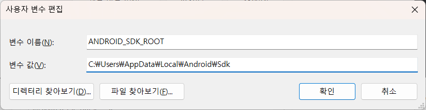 사용자 변수에 "ANDROID_SDK_ROOT" 설정을 추가 합니다.