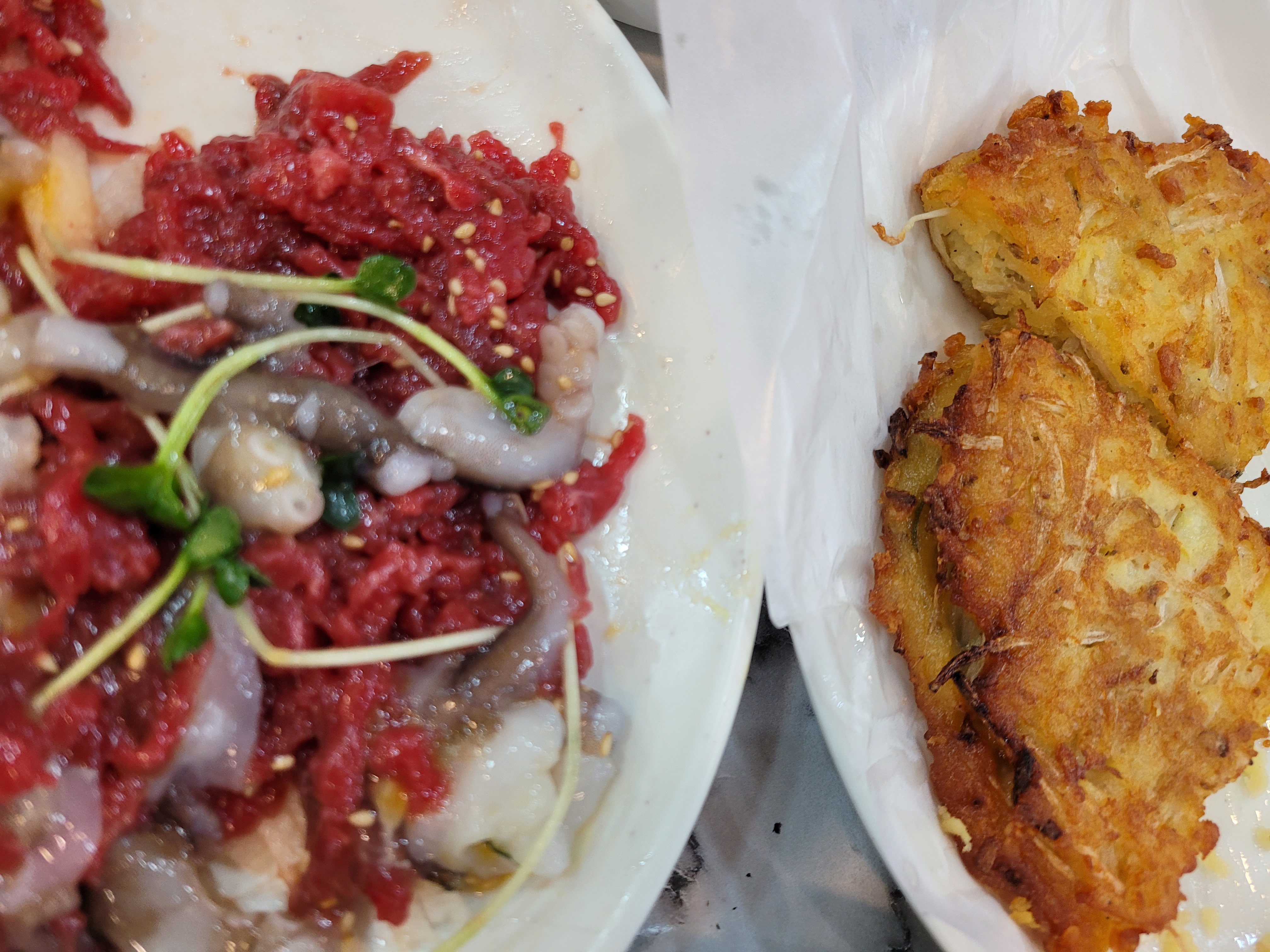 육회탕탕이와 막걸리를 마시기로 해서 빈대떡도 주문했어요