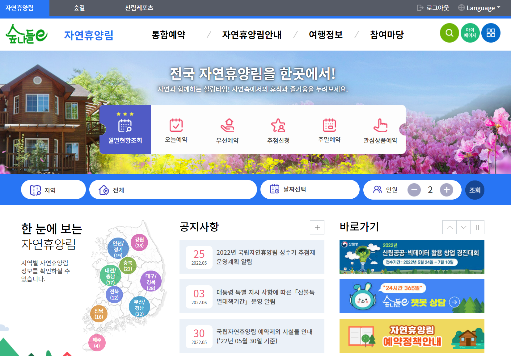 2022년 국립자연휴양림 성수기 추첨 예약일 안내