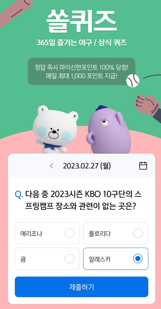 쏠야구 쏠퀴즈 오늘의ox퀴즈 2월 27일(월요일) 신한플레이