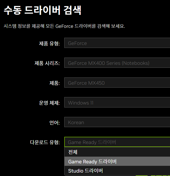 Nvidia 사이트에서 드라이버 검색