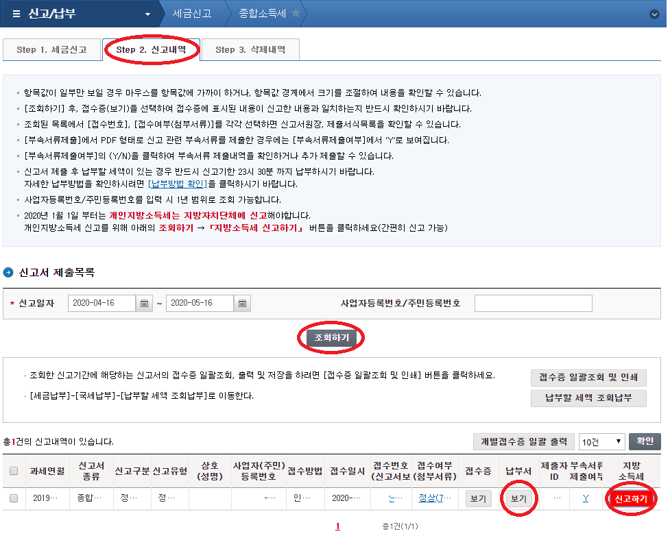 종합소득세 납부 > [Step 2. 신고내역] 을 선택하고 "조회하기" 버튼 클릭