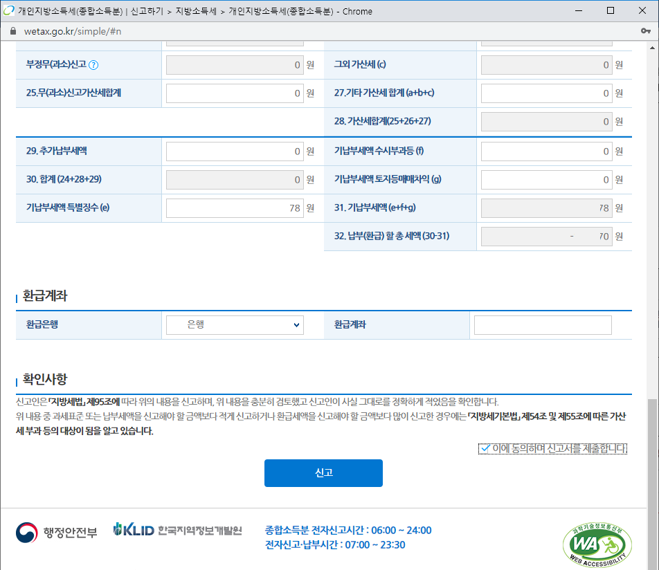32. 납부(환급)할 총 세액을 확인하시고, 이슈가 없다고 판단되면 [신고] 버튼 클릭