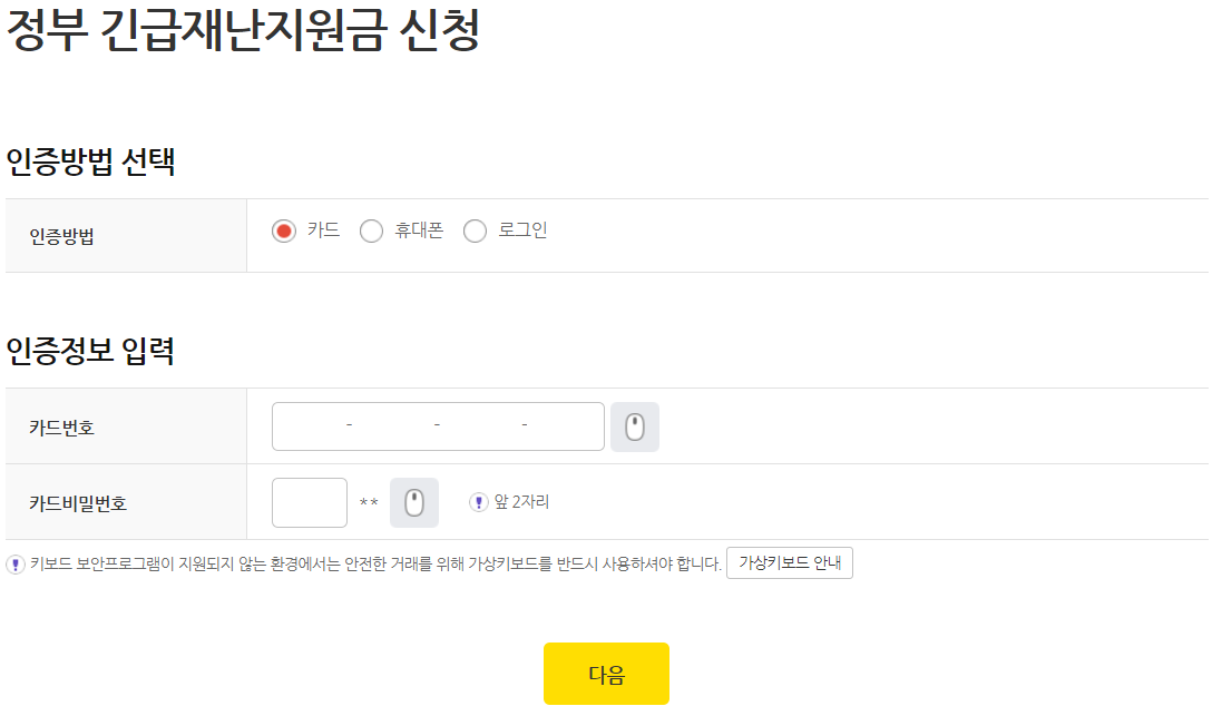 "신청 완료" 안내 페이지가 나오지 않고 "정부 긴급재난지원금 신청" 이라는 화면이 나왔습니다.