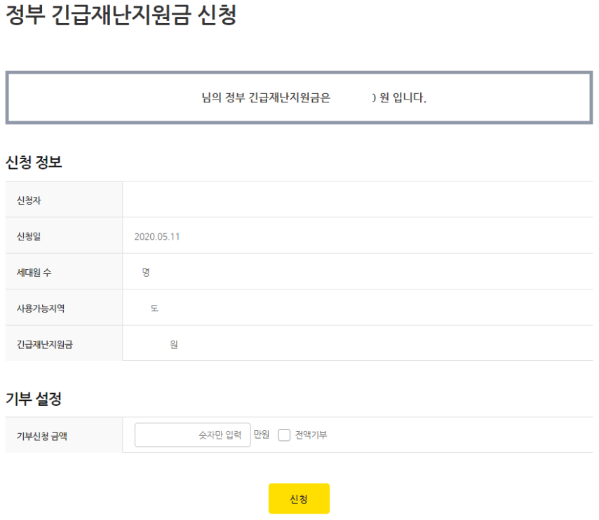 만약 신청금액에 지원금 금액이 자동으로 입력되어 있었다면? 기획에서 부터 기부를 유도하는 듯한 오해를 부를수 있을겁니다. 만약 의도된 기획 이라며, "신청" 버튼을 "기부하기" 로 표현하여 고객에게 최소한의 정보를 제공해야 하지 않을까 생각 됩니다.