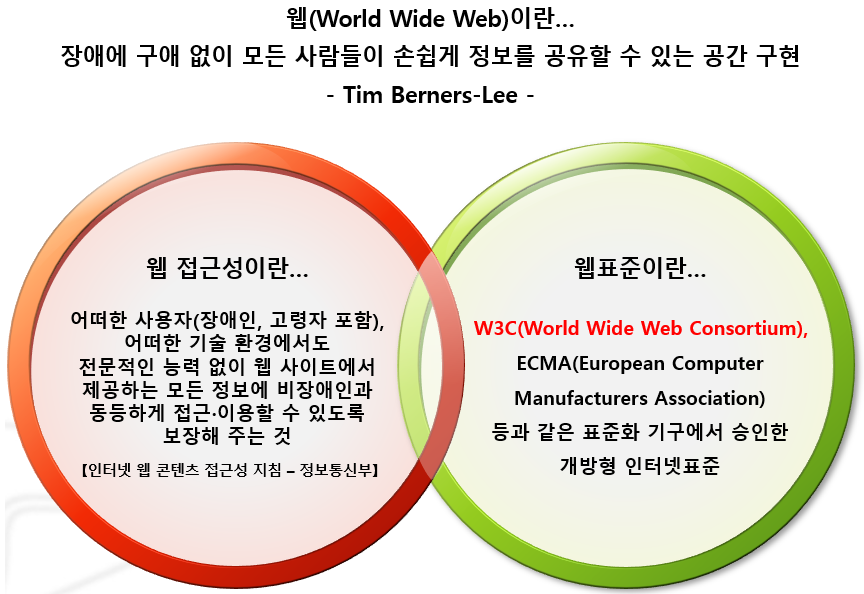 기타 자료실 HOME > 정보마당 > 기타 자료실 웹의 힘은 그것의 보편성에 있다. 장애에 구애없이 모든 사람이 접근할 수 있는 것이 필수적인 요소이다. (The power of the Web is in its universality, Access by everyone regardless of disability is an essential aspect.) 팀 버너스 리 경 - 웹의 창시자 (Tim Berners - Lee , W3C Director an