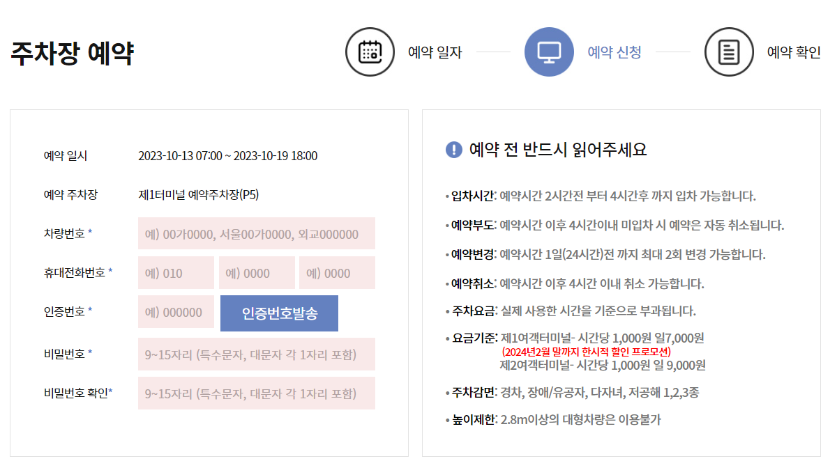 주차할 터미널과 일자, 차량정, 핸드폰 번호만 있으면 가능.