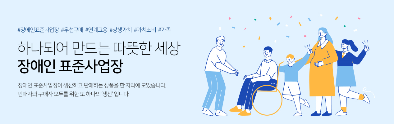 장애인 표준사업장이 생산하는 재화와 서비스를 공공기관, 대기업, 그리고 일반 소비자가 편리하게 검색하고 구매(구매처 링크, 구매정보 제공)할 수 있도록 설계된 기업 상품 전용 소개사이트입니다.