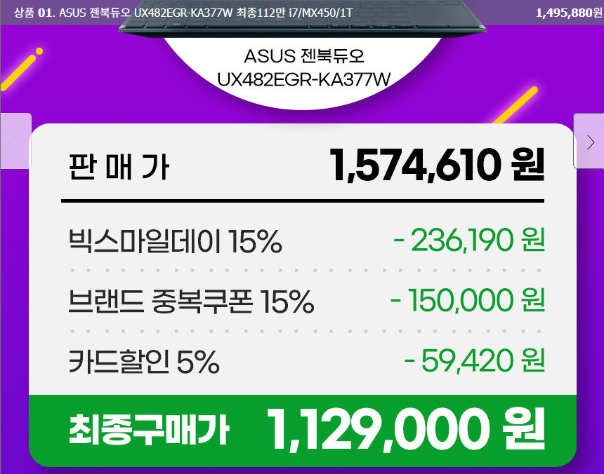 지마켓 빅스마일데이 - ASUS 젠북듀오 UX482EGR-KA377W 노트북최저가 굿