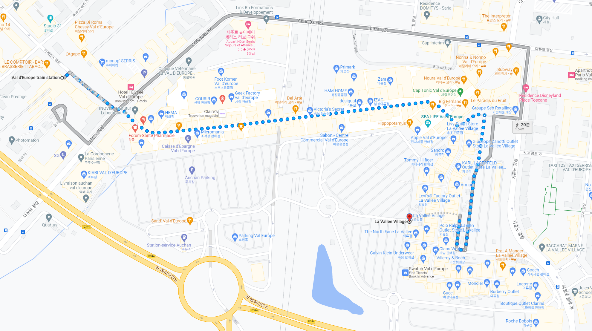 RER역(Val d'Europe train station)에서 아울렛 까지는 파란색 점선을 따라 가시면 되요 ^^