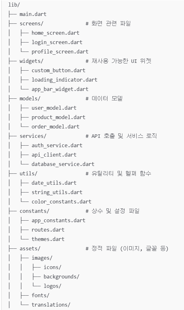 - 네이밍 예: login_screen.dart, home_screen.dart