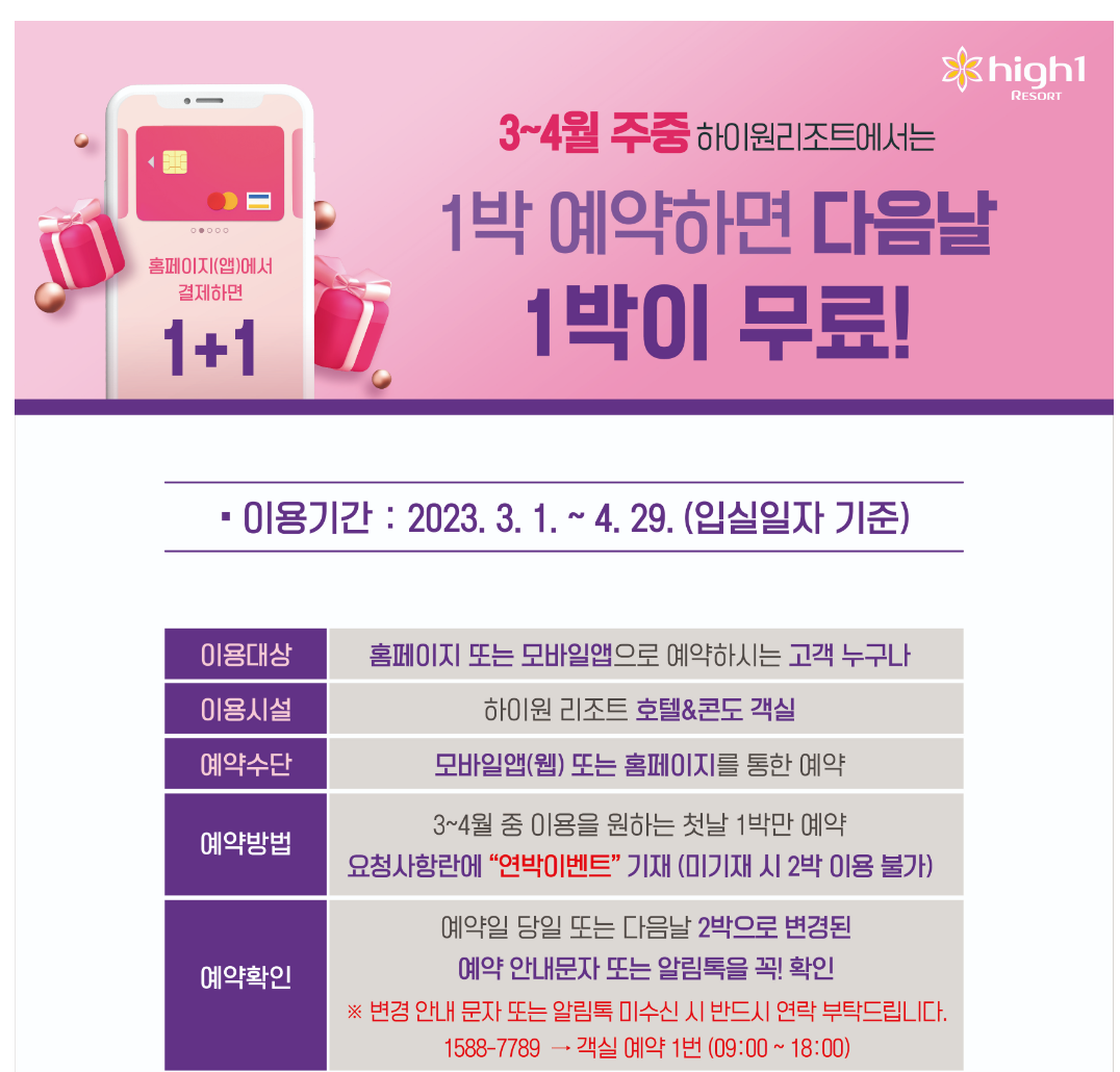 3월~4월 1박하면 1박더 1+1 이벤트 중 입니다.