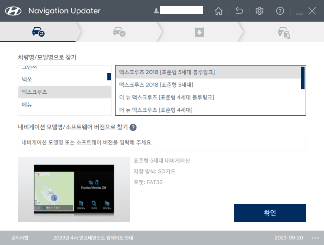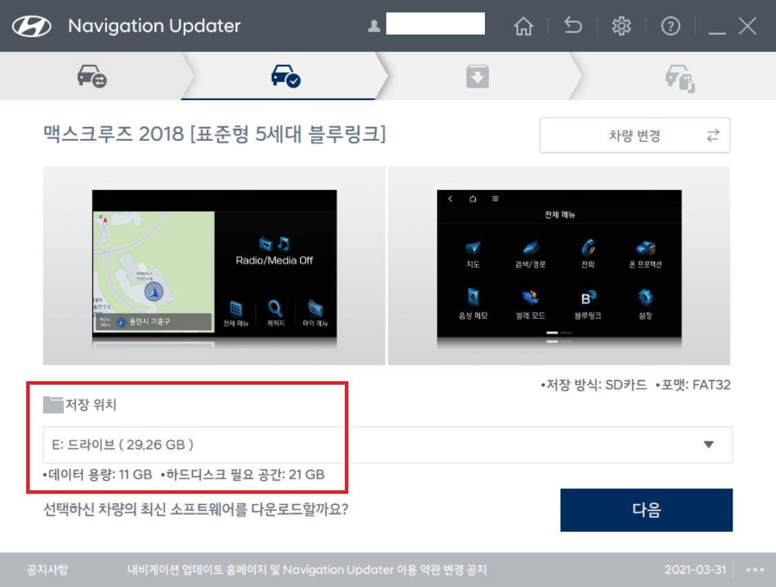 내비게이션 모델을 선택하신 후 소프트웨어를 설치할 메모리 드라이브를 선택합니다.