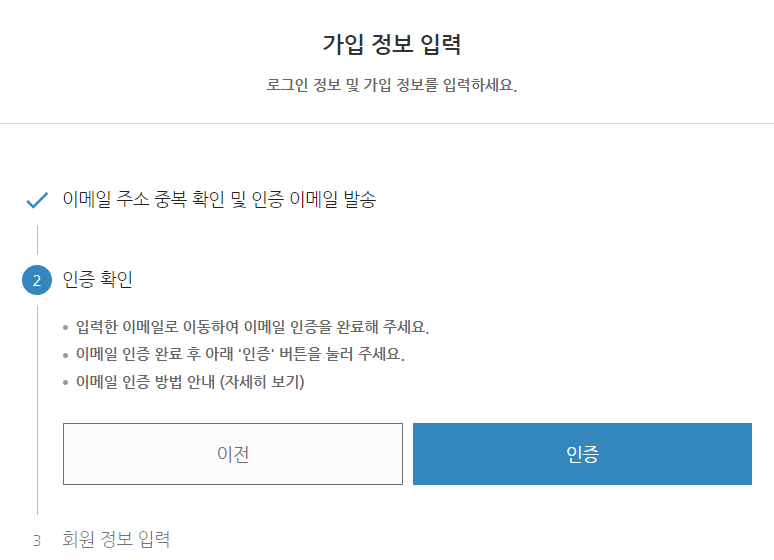 다시 회원가입 화면으로 돌아와서 또(?) 다시 [인증] 을 누릅니다.