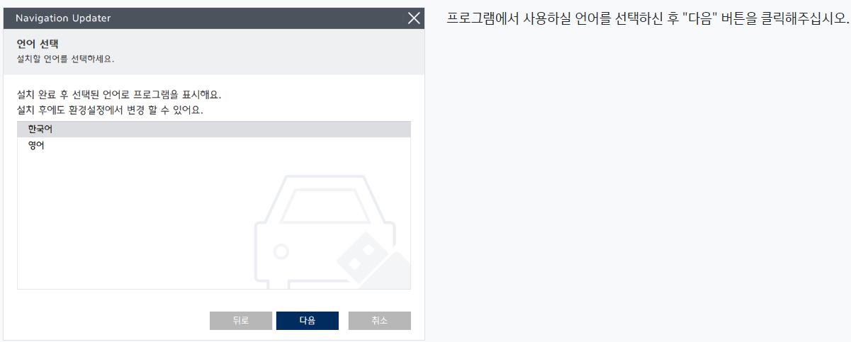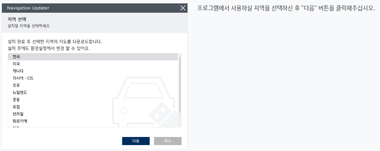 설치가 완료된 후 Navigation Updater 창이 나오면 본인이 소유한 자동차의 제조사를 선택 합니다.