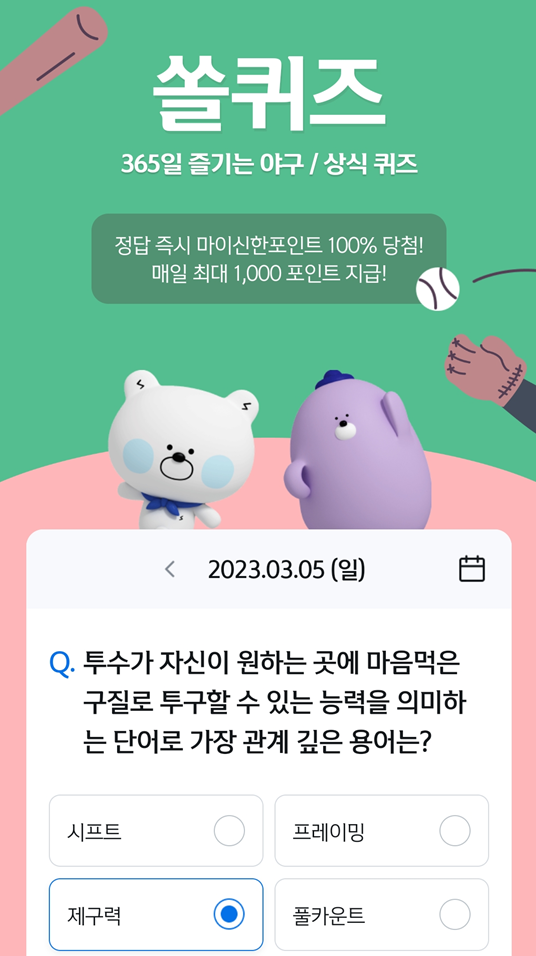 3월5일 쏠야구 쏠퀴즈 신한플레이 오늘의ox퀴즈
