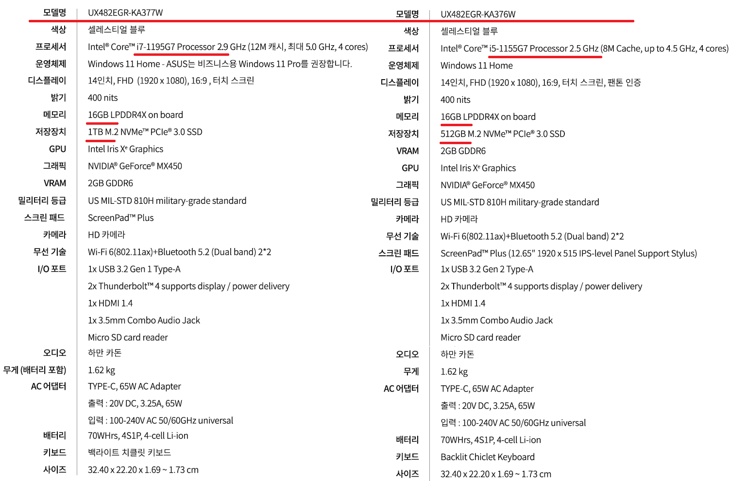 UX482EGR-KA377W vs UX482EGR-KA376W 모델 비교