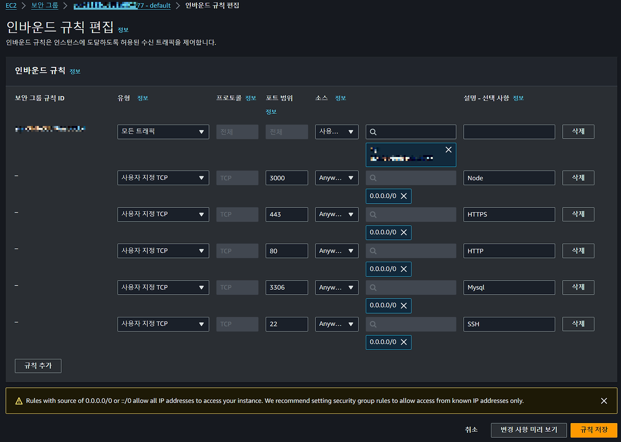 default 인바운드 규칙을 내 인스턴스와 동일한 네이밍으로 복사해서 사용 했습니다.