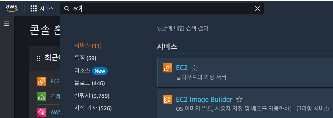 콘솔 홈 화면이 나오면, 화면 상단 검색 창에서 "ec2" 검색 또는 EC2 클라우드의 가상 서버 링크 선택