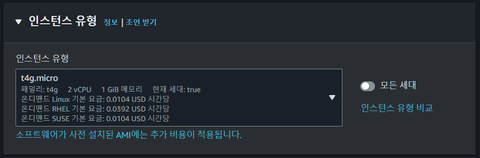 인스턴스 유형은 : t4g.micro ... 개발 서버로 충분할지 모르지만, 월 8만원 목표로 최소한으로 구성 예정
