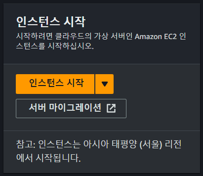 콘솔 화면 중간에있는 "인스턴스 시작" 을 눌러 인스턴스를 새로 생성 합니다.