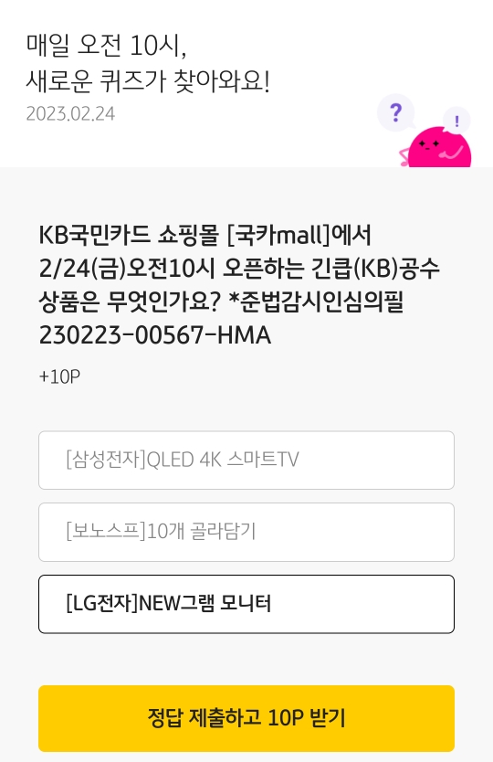 정답을 맞추면 KB포인트 10포인트를 획득합니다.