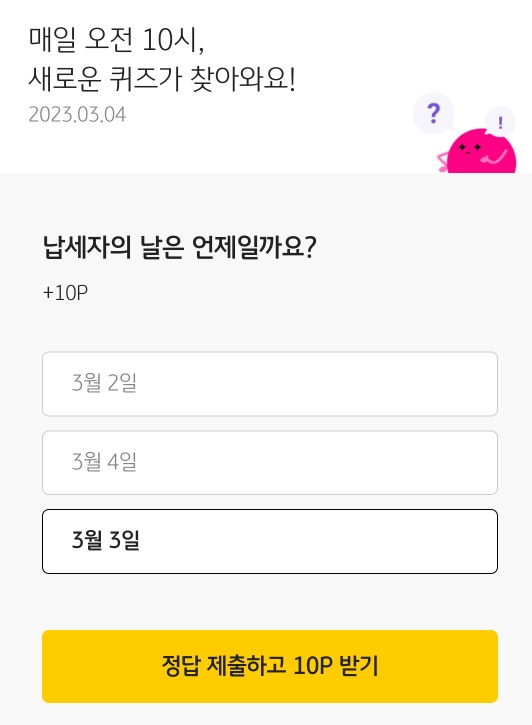 | 쏠야구 쏠퀴즈 신한플레이 오늘의ox퀴즈 3월 4일(토요일) (0) | 2023.03.04 |