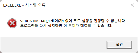 마이크로소프트 오피스 엑셀을 실행하면 "VCRUNTIME140_1.dll이(가) 없어 코드 실행을 진행할 수 없습니다."